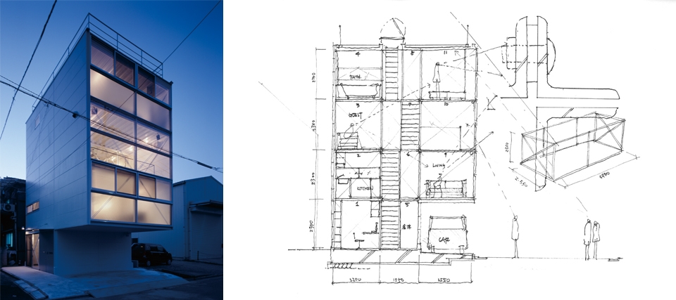 私が独立後最初に設計した住宅は、土地が50m2、建築面積が30m2という小さな住宅でした。「11boxes」と呼んでいる家です。この設計を始めた当時、私は既に金物製作会社で働いていたことがあったため、家具のような住宅ができないかと思っていました。家具スケールの構造材を組み合わせていくことで、内部における家具と建築構造を一体とし、軽やかな空間を作り出すことが出来るのではないかと思ったのです。