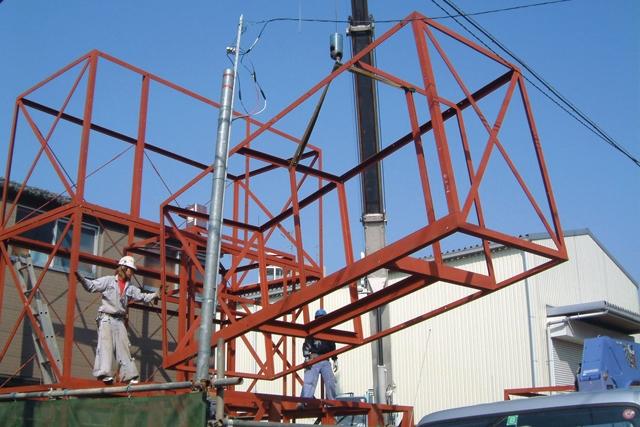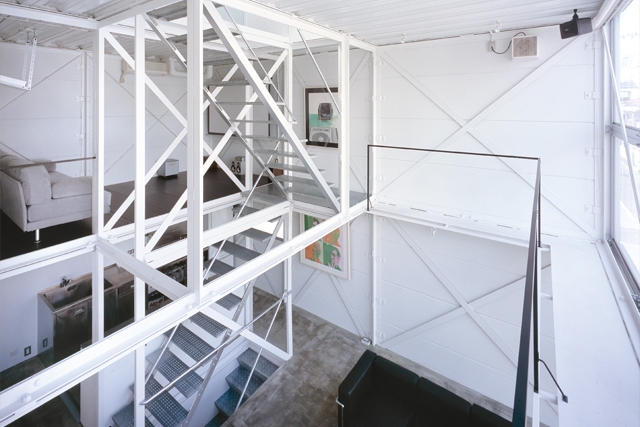 メインの構造は75mmのLアングル。その材料を使ってコンテナのような箱を11個作り、まるでカラーボックスを重ねていくような形で積み上げています。階段やファサードのサッシも同じ材料で作っています。コストを絞り込むことと工期の短縮を狙い、ボックスは工場で精度良く作り、サッシや外壁の取り合いにおいて無駄な部材を付けなくてもいいようにしています。また箱の大きさは小さな土地に対して、効率よく機能が収められるように3種類のスパンを計画しました。2.2m、1.75m、そして2.55mです。出来上がった家は、テントのような軽やかさのある家になりました。倉庫のような自由度のある空間で、かつ家具の中にいるような包まれた感覚もありました。当初のクライアントとの目標であったローコストでかつ短い工期で出来た上、裏のテーマでもあった、住宅のプロトタイプとして敷地形状に併せて家具のように生産できそうな雰囲気も持っていました。