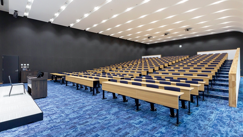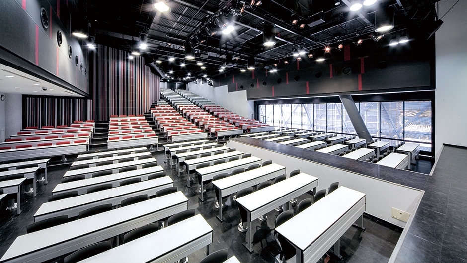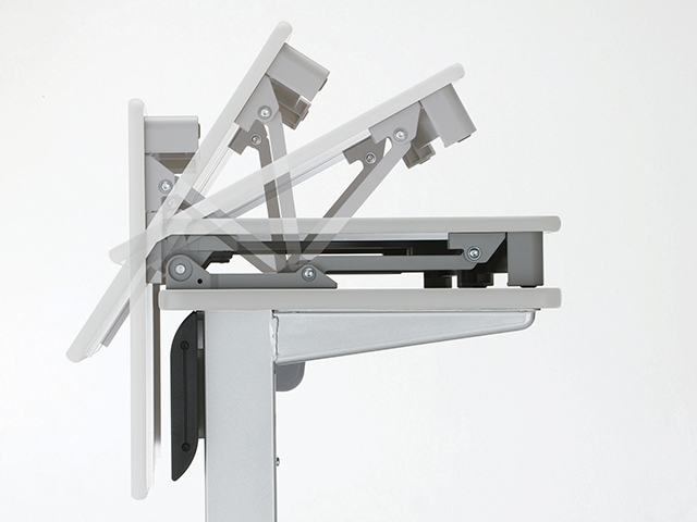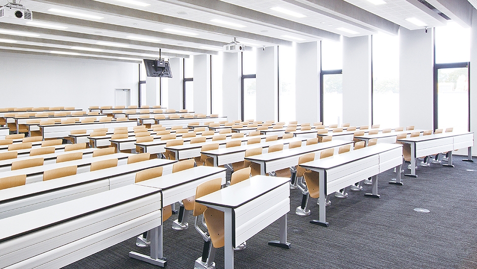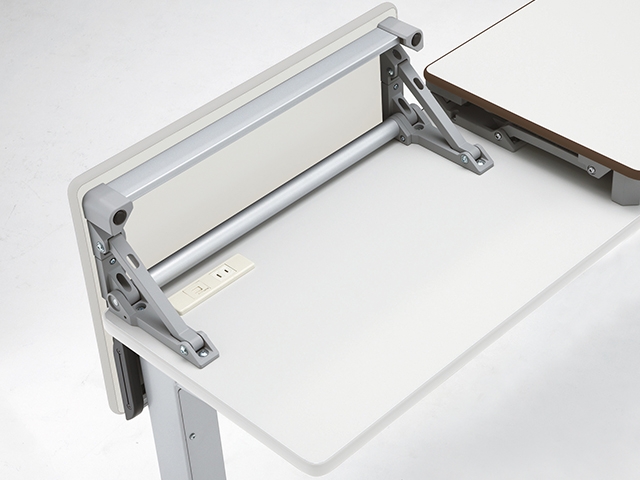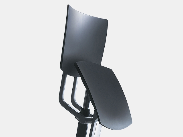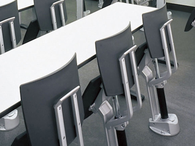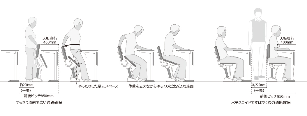 着座姿勢で前後移動する際、前のめりにならず、ひざへの負担がほとんどありません。また背もたれが連動し、容易に姿勢変更ができます。長時間の講義でも疲れにくく、机との距離を調節することが可能です。