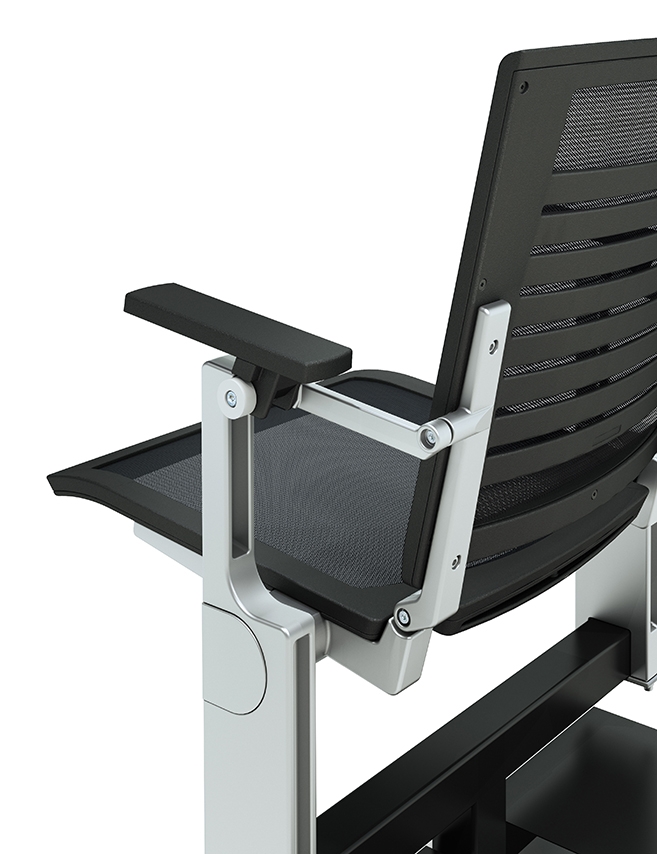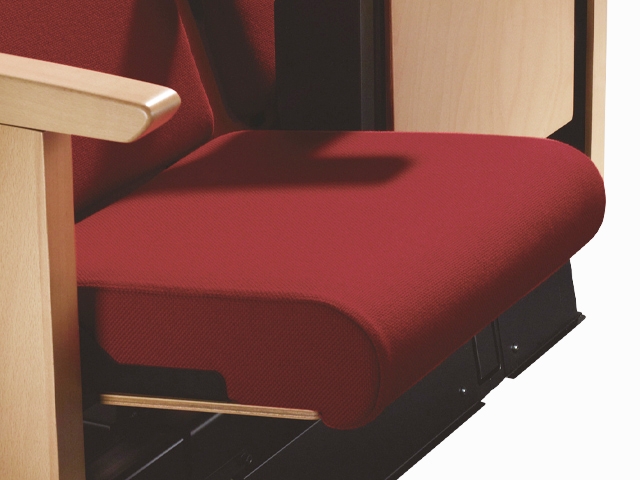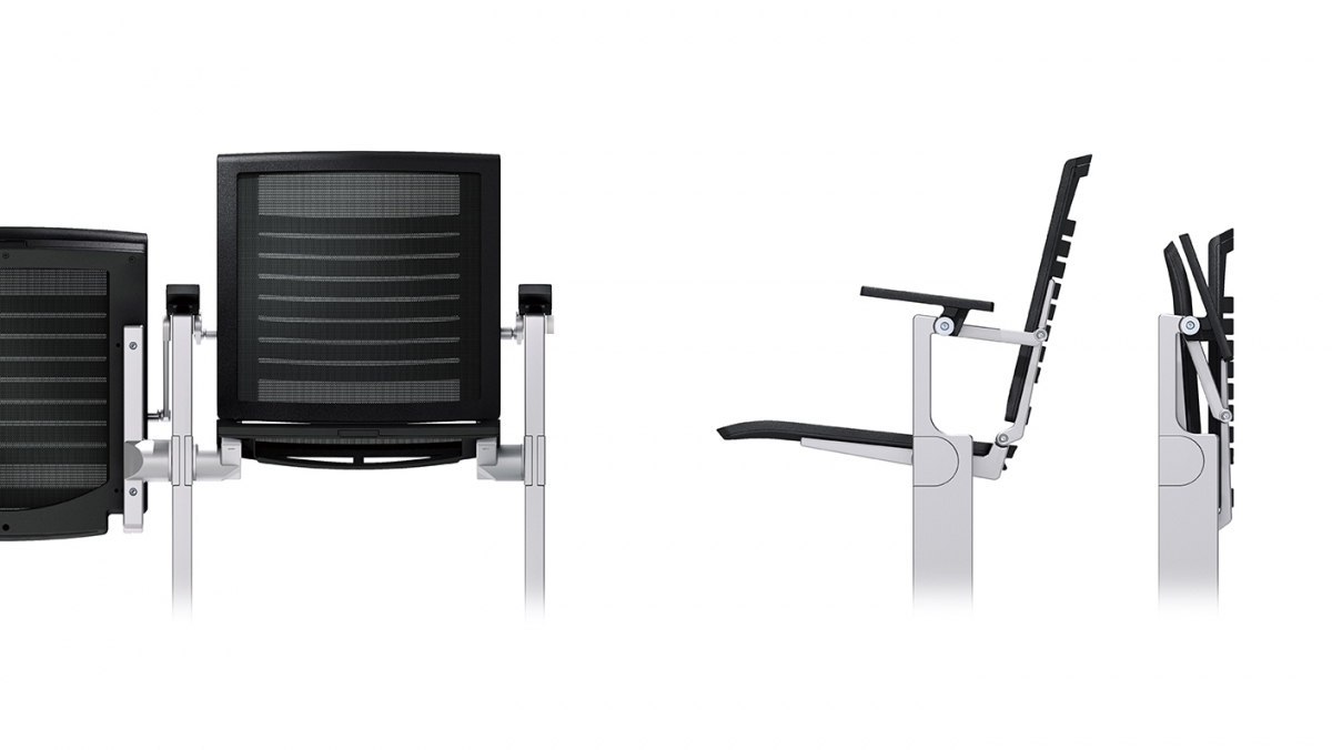 離席時には自動的に座が跳ね上がり、背もたれと肘掛も同時にコンパクトにたたまれます。快適な座り心地を実現するため、背と座は十分な大きさを確保しながら、離席時の収納性を限界まで高めることで、通路幅を最大限に確保しています。