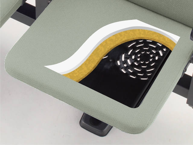 09Mタイプの背もたれと座面には、オリジナルファイバーメッシュシートを移動観覧席の客席として世界で初めて採用。メッシュシートのテクスチュアと、背もたれ裏面のカバープレートが、軽快でクールな印象を与えます。