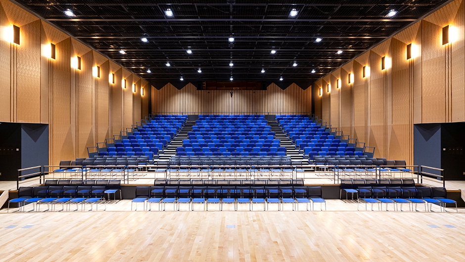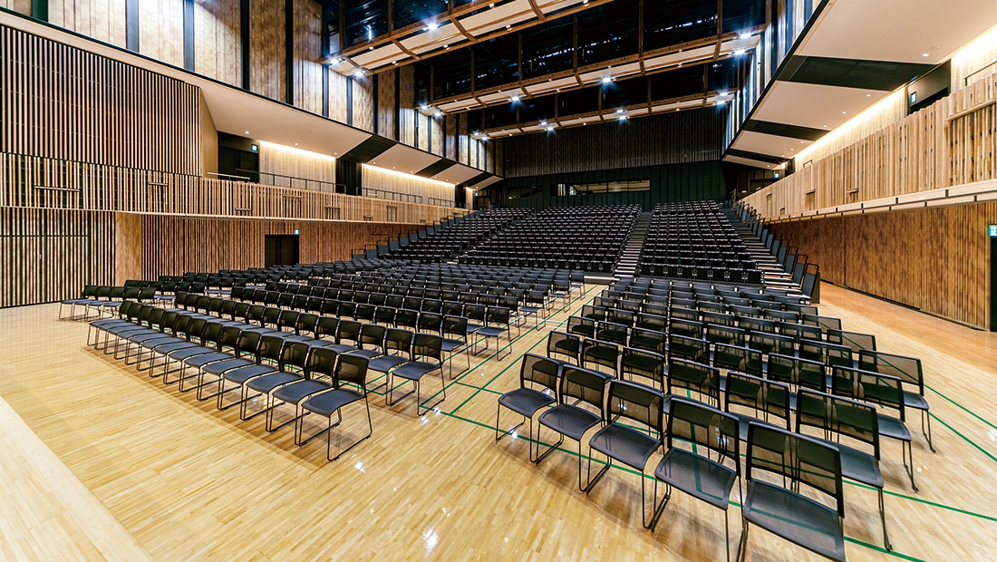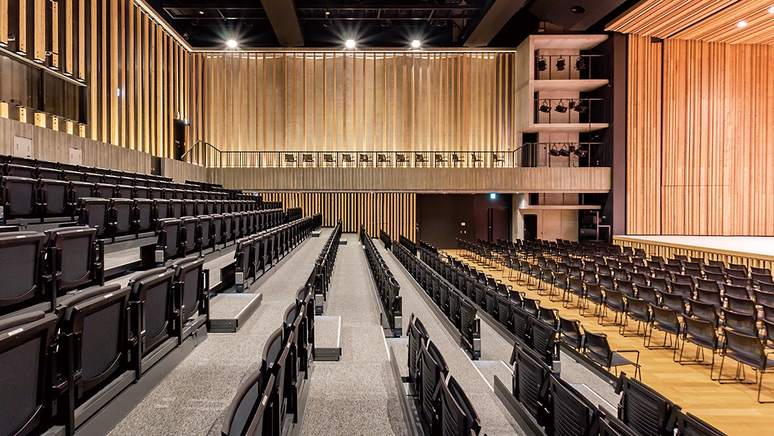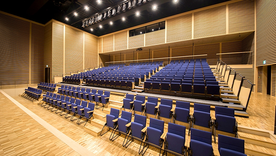 移動観覧席を初め、床固定席、スタッキングチェアのような可動席など、ホール内の客席全体の意匠を、同じイメージで統一できます。