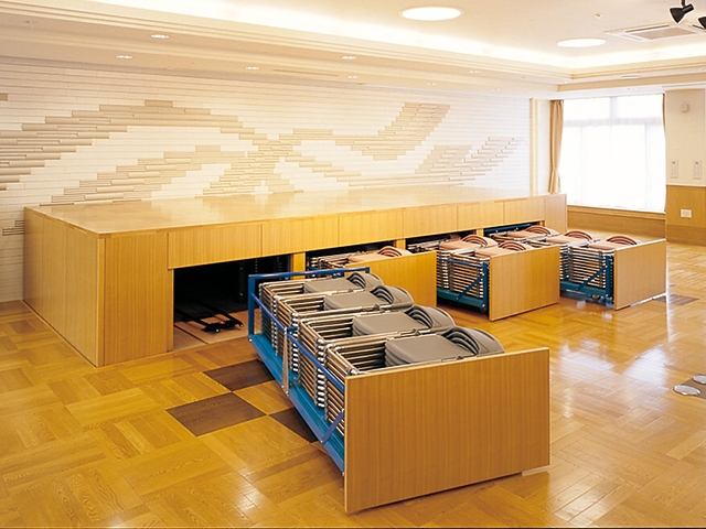 ステージ下は、ホールで使用するイスの収納スペースとしても活用可能です。出し入れに便利な専用台車を用意いたしております。
