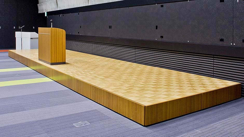 アイステージEVは、多目的ホールで威力を発揮する高さ自由自在の電動ステージです。ボタン操作一つでステージが上昇し、ステージとして使用しない場合はホールのフロアと同一面(0レベル)にすることができます。もちろんステージの高さはあらかじめ設定された最高の位置までセッティングができ、催事内容に合わせた演出が可能です。スペース効率に加え、省人化・省力化を同時に実現したステージフロアです。