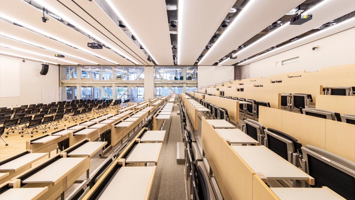 東京都市大学 世田谷キャンパスの7号館 TCUホールは、タブレット付の移動観覧席を備えた多目的ホールです。タブレットはA3サイズの書類を余裕を持って載せられ、一般的な講義にも十分対応できます。また移動観覧席の前9段だけ展開して後ろ4段を収納する、利用席数を絞った設定も可能です。これらの機能によってホールの利用の幅が拡がり、可動率も上がります。