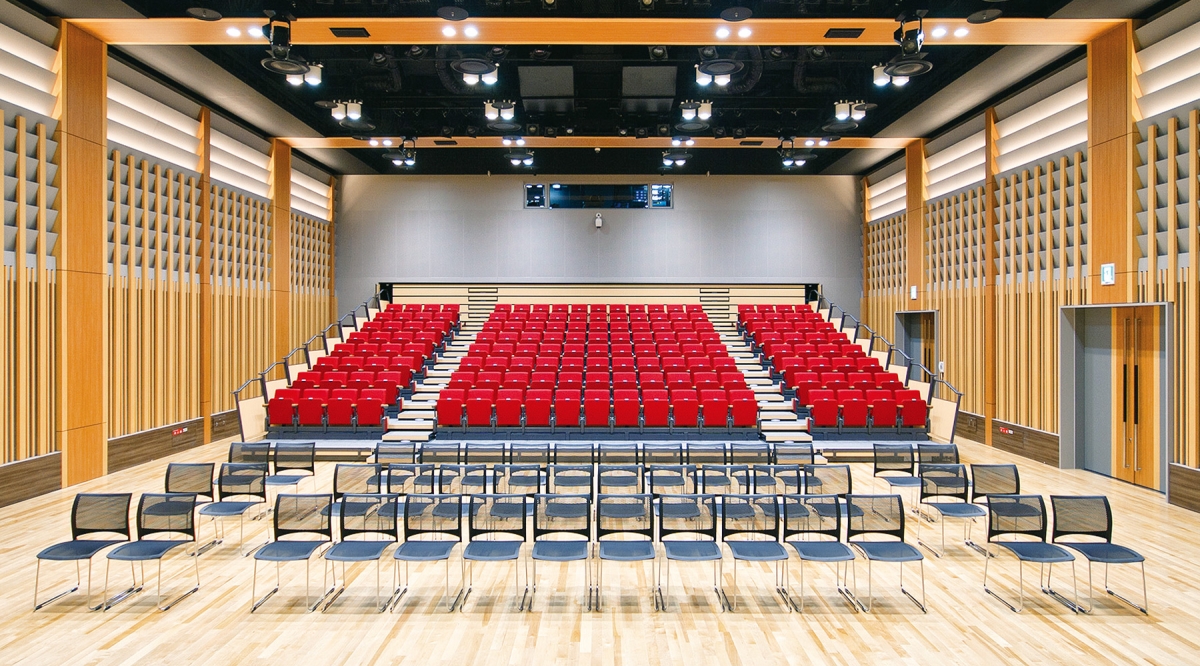 大型タブレットを装備した移動観覧席が多目的ホールの活用領域を広げます。