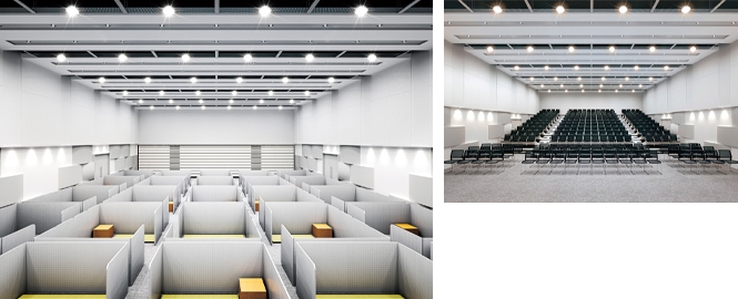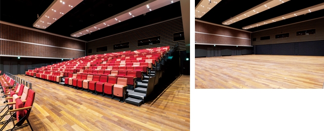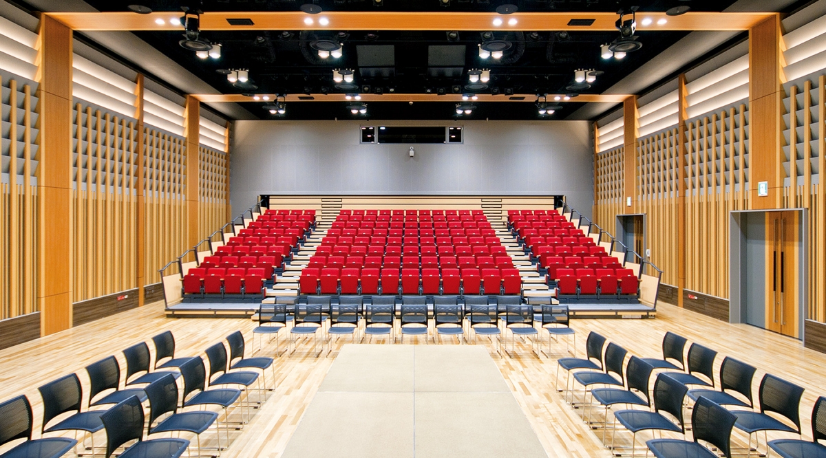 テレスコープスタンドを前方に移動することにより、少人数の催しの際にも、人数に合わせて、客席を舞台近くに設置することが可能です。後方の空間を展示会場にするなど、用途を分けた空間利用も可能になります。