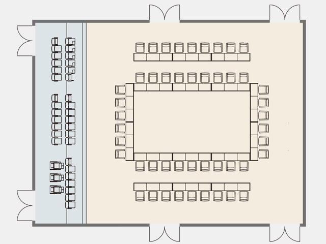 議員と執行部の机は一人用のユニットなので、さまざまな組み合わせができ、議場の多目的利用の可能性がひろがります。また、机はコンパクトに折りたため、傍聴席の下部スペースに収納できます。