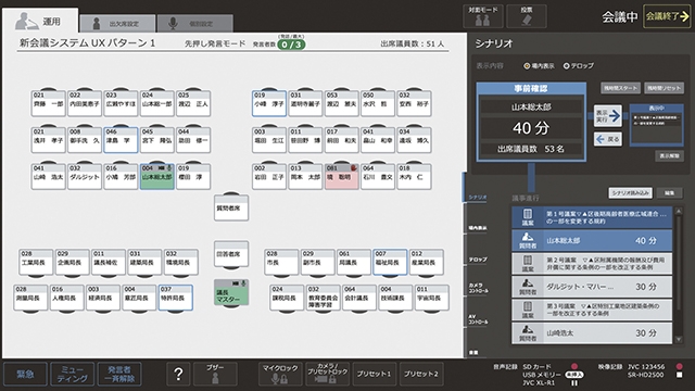 ■発言者の選択によって、マイクの制御と同時にカメラは発言者に向き、発言者名のテロップも同時に挿入されます。