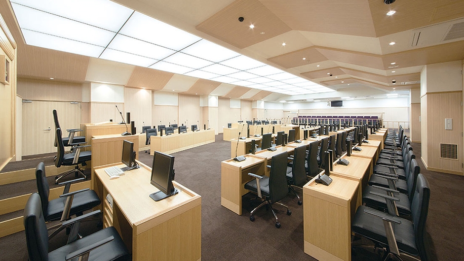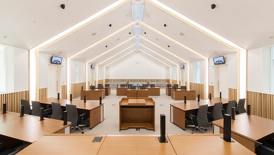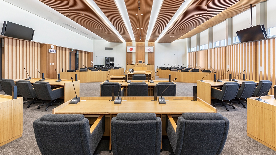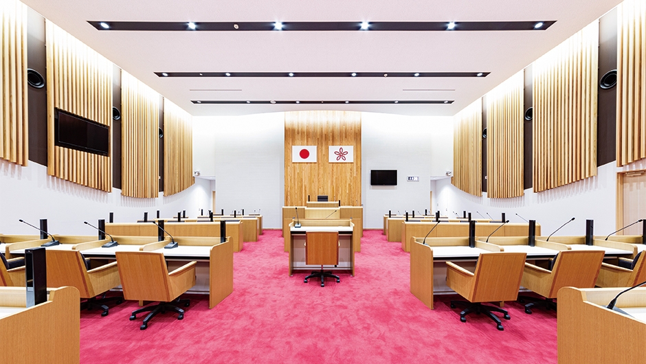 議員側と執行部側が対面する配置ですが、議場の多目的利用を図るために、段床のないフラットな床となっています。家具は机、椅子共にキャスターを装備した可動型となります。