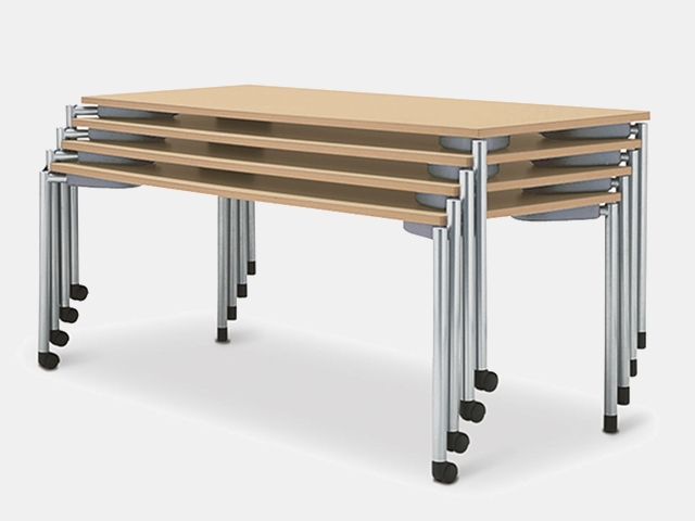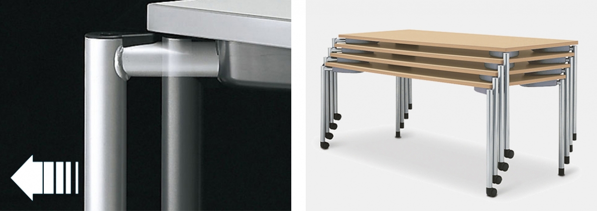 テーブルのレイアウト変更では、キャスターを接地させながらテーブルの片側を持ち上げることで楽に移動できます。また、キャスター側の脚を水平に引き出せば積み重ねられるので合理的な収納ができます。
