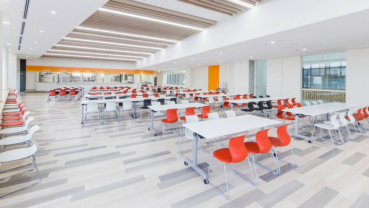 天板がフラップする機構に連動して、4点のキャスターが上下するシンクロトップシステムを採用しています。設置時は確実にテーブルを固定し、移動時はストッパーの解除し忘れによる故障を防ぐ安全で安心の構造です。キャスターロックの手間もなく、移動・設置が簡単に行えます。