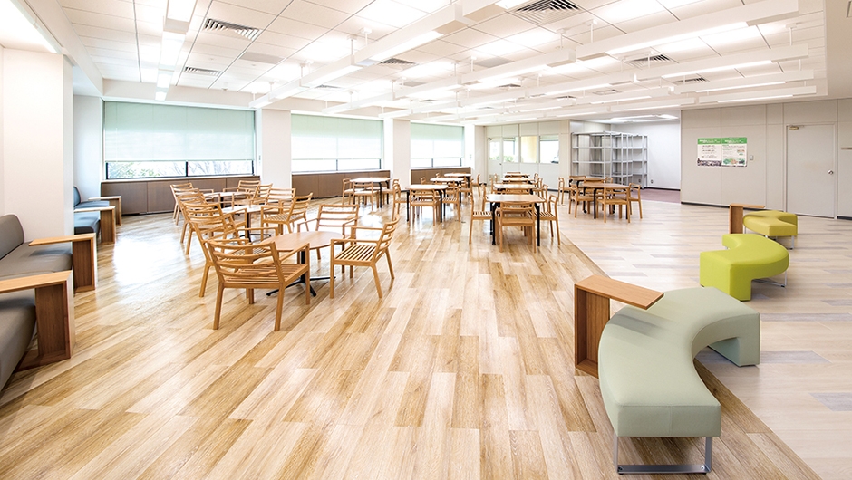 改修に伴いリニューアルされた社員の共有スペースでも、そのコンセプトを意識した空間づくりがなされており、一般の木材に比べて成木になるまでの成長が早く、環境にやさしい「竹」を素材とした家具が採用されています。