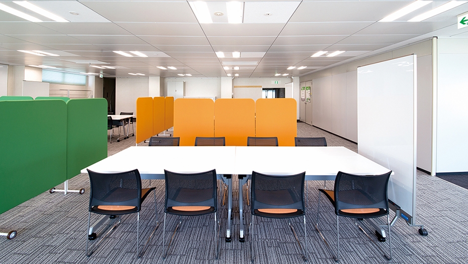 研修室/イス:ルッシュ、テーブル:フリプト、ホワイトボード、パーティション