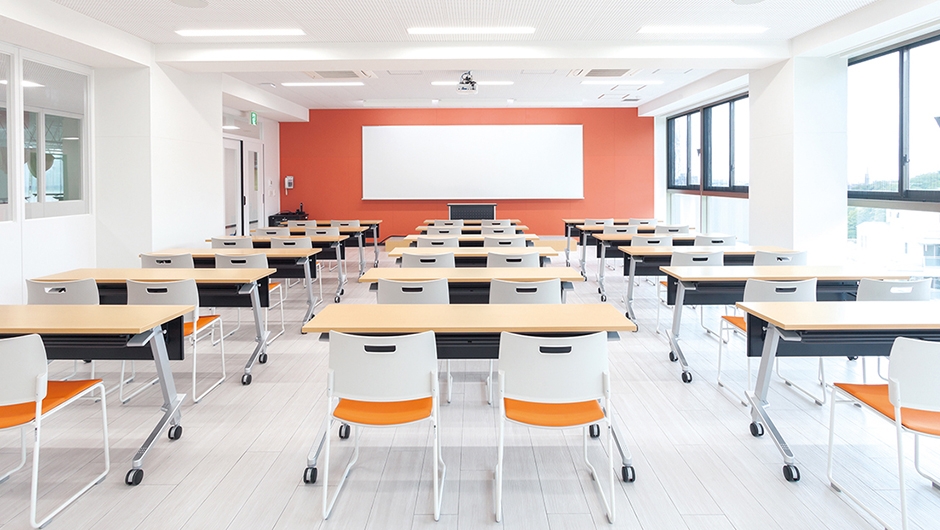 各講義室のイスは、壁面の色に合わせて座パッド色が配色されていて、カラフルで明るい空間づくりがなされています。