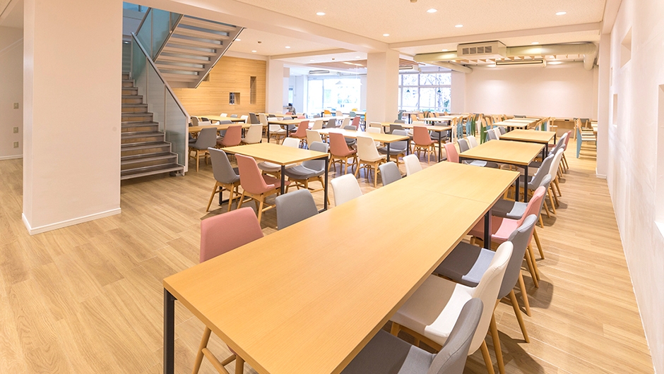 リニューアルされた食堂は、ナチュラルテイストのカフェをイメージしており、学生にとって居心地が良い空間となっています。
