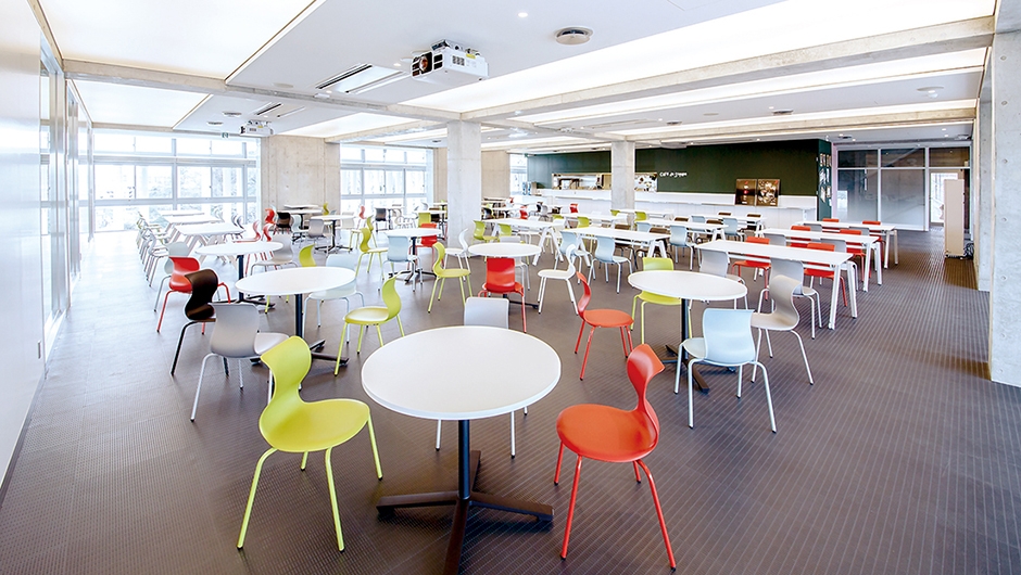 新3号館には、アクティブラーニングに対応した教室が増設されたほか、学生ラウンジやカフェなど学生にとっての憩いの場も設置されており、ダークグレーのラバータイルに6色の背・座カラーのイスが際立つ空間となっています。