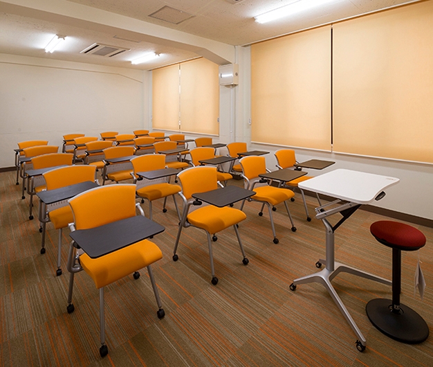 アクティブラーニング教室ではタブレット付のイスが採用され、学生が自由で活発に発言できるように配慮されています。またタブレットを収納することで、テーブルと組み合せて使用することもでき、様々なバリエーション展開ができます。