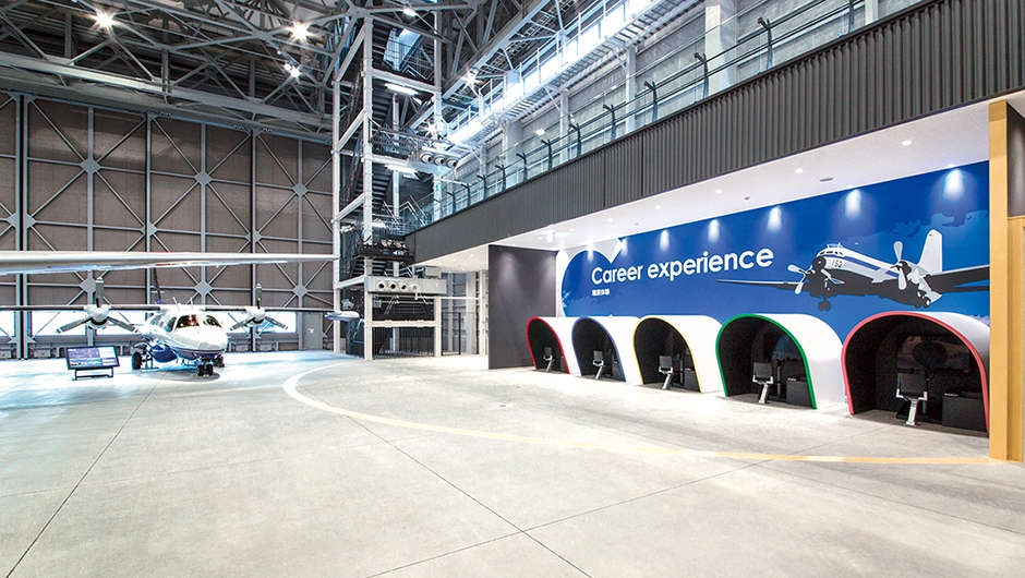 2階オリエンテーションシアターは3D仕様のスクリーンが設けられ、航空機づくりの歴史を来館者に紹介します。また、職業体験コーナーではフライトシュミレータが5基設置され、パイロットの仕事を疑似体験することができます。
