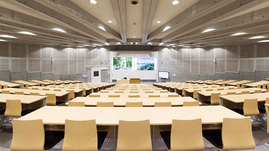 改修前のレイアウトは、円弧の中心から放射状に通路が配置されていましたが、今回すべての通路を平行に配置し、5人連を基本とした短い連数とすることで、中央部の座席にもアクセスしやすくなりました。奇数の5人連は、試験利用などの際に1席おきに着席しても効率よく席数を確保することができます。また、階段状の教室のため、各デスクの幕板を床付近までしっかり確保して、受講者の足元を隠す配慮をしています。