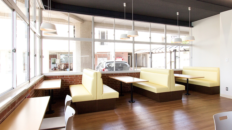 リニューアルされた食堂では、新たにプールを眺めながら座ることができるカウンター席、グループで利用できるソファ席が設けられ、生徒の利用形態に合わせた使い方ができるようになりました。また、AV設備も備えられており、保護者会等、多様な利用目的に対応できる場となっています。