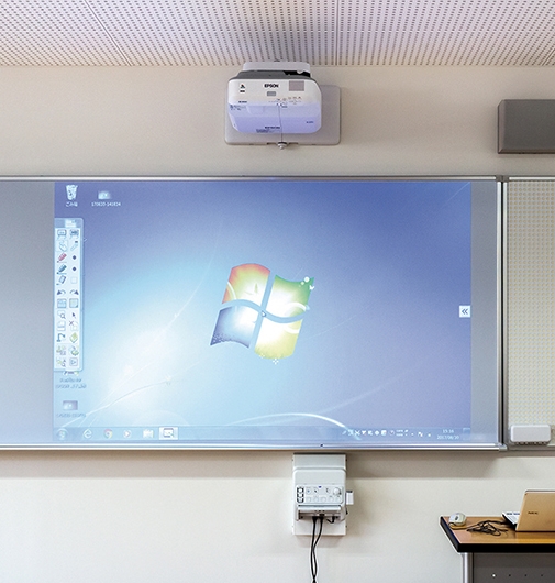 新校舎の教室には電子黒板が採用され、授業の効率化が図られています。将来的にはインターネット環境に接続することも想定されており、より効果的な授業の展開が期待されています。