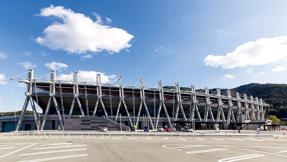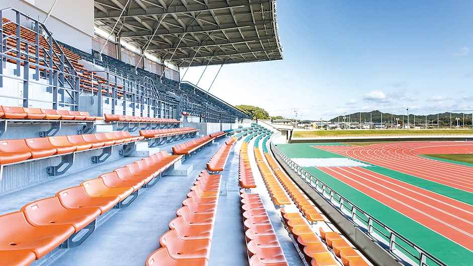 2018年のインターハイ、2021年の国体開催に向け、三重交通G スポーツの杜 伊勢 陸上競技場がリニューアルされました。メインスタンドは国体の開催基準に合わせるため全面改築がなされ、バックスタンドの改修も行われました。メインスタンドは「伊勢」に呼応した外観として、「組柱」や「木組み」といった伝統技術をイメージさせる架構デザインがなされています。観覧席は約6,000席から約7,000席に増やし、客席の色は伊勢の海と山を表現した、ブルー、グリーン、オレンジが効果的に配色されています。