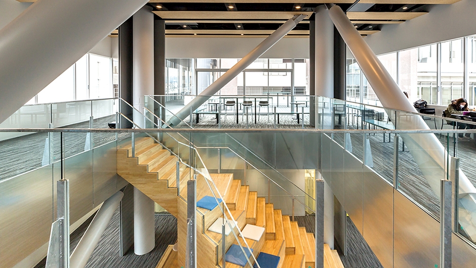 学園創立70周年の記念事業で建設された新4号館は、「透明なコアとピン柱」の組み合わせで地上6階までの層を支える構造を特徴としています。学習活動をはじめ、多彩な交流とコミュニケーションが生まれる拠点であり、キャンパスのアクティビティとインフラの中核として機能しています。また、学校建築・設計の第一人者として有名なシーラカンスアンドアソシエイツのプロジェクトとしても注目されています。