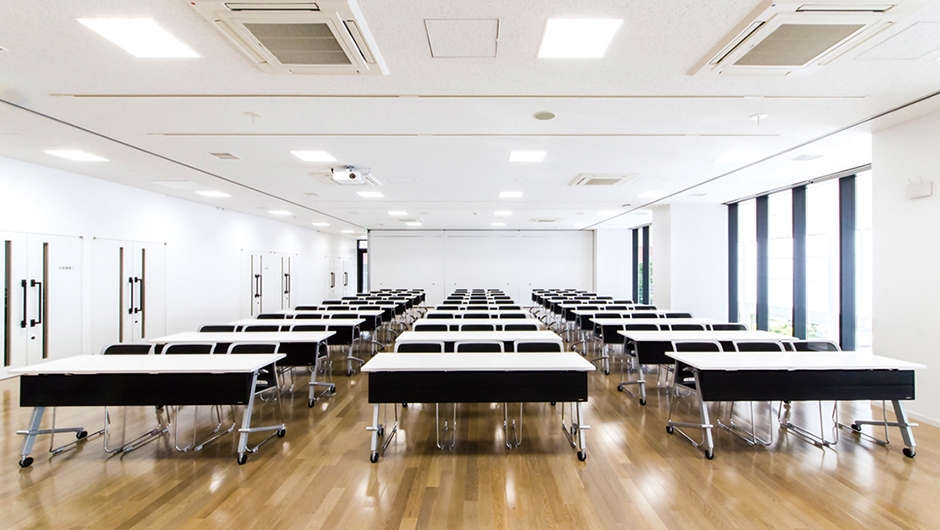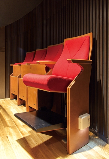 馬蹄型の多目的ホールは、2階の一部が見えづらくなるバルコニー席の視界を確保するため、床レベルを高くし、さらにそこへ配置する座席自体もハイチェアとすることで、どの座席からもステージ上がよく見えるよう配慮された設計となっています。