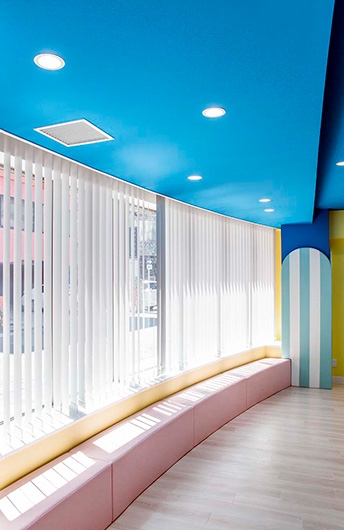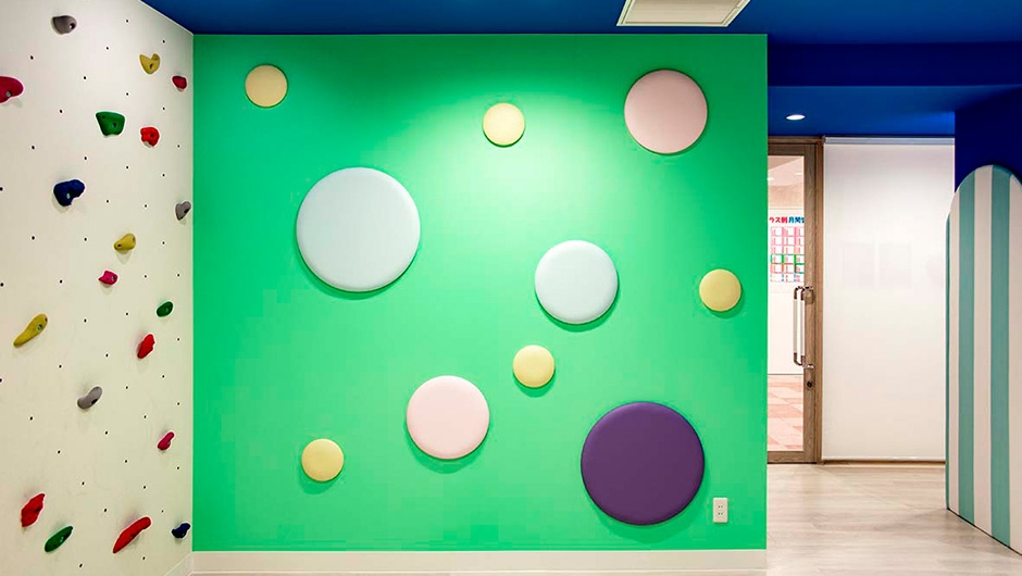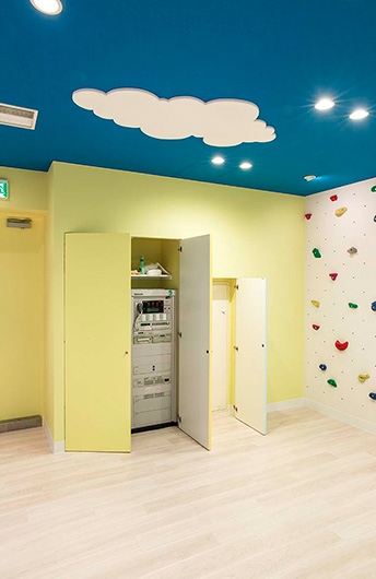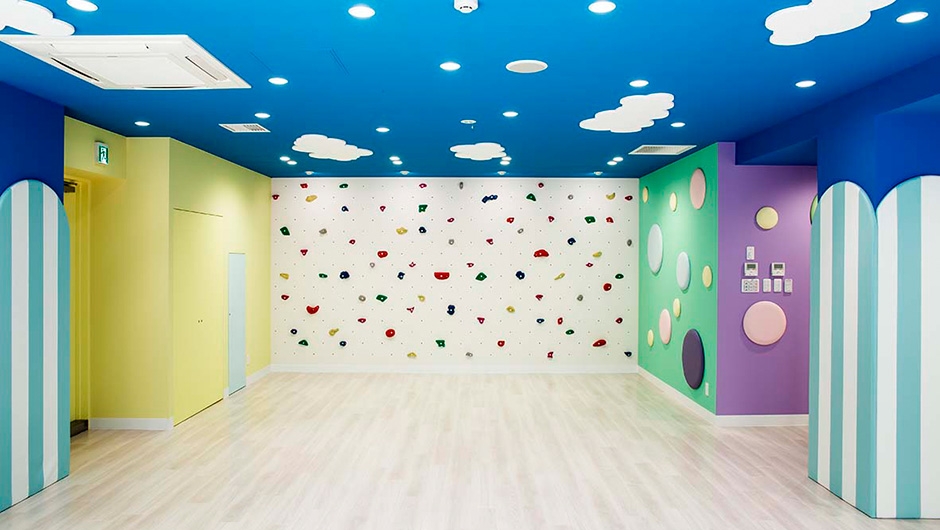 ボーダー柄のクッション材を貼付けた柱型や、天井面の雲など、子どもたちを楽しませる演出がなされています。