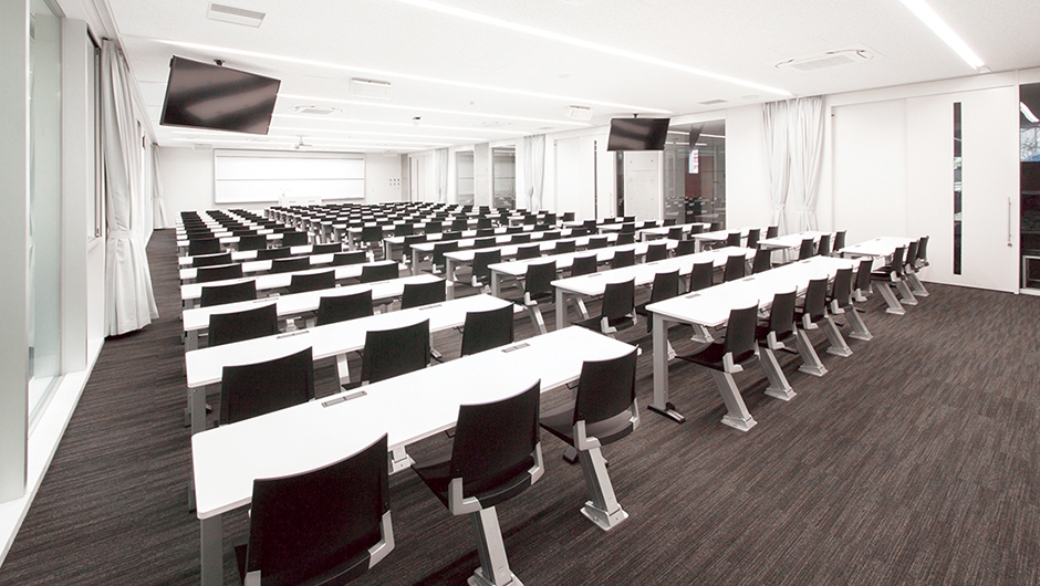 Q101教室/講義デスク・イス:SCF-PF-5105特注品、移動イス:SCM-5105-C、移動デスク:SCM-5505-T特注品 固定席181席・移動席6席 総席数187席