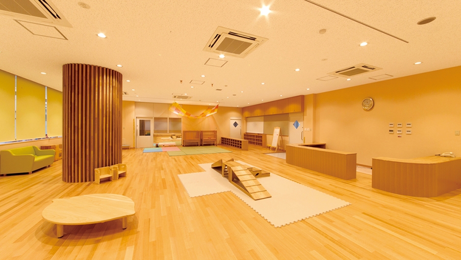 プレイルーム/カウンター特注品、本棚特注品、遊具、おもちゃ一式、ベンチ、キッズテーブル、キッズチェア、ソファ、マット一式、ユニット畳、ベビーベッド、柱装飾、ロールスクリーン