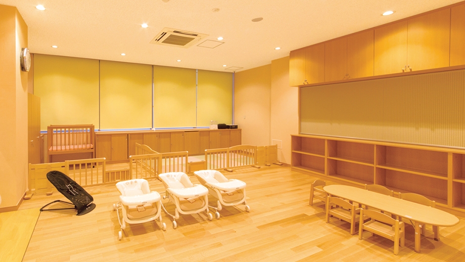 一時保育ルーム/本棚特注品、キッズテーブル、キッズチェア、ベビーベッド、ベビーバウンサー、ユニット畳、パーティション、家電一式、ロールスクリーン、カーテン
