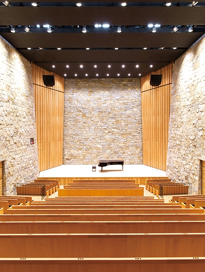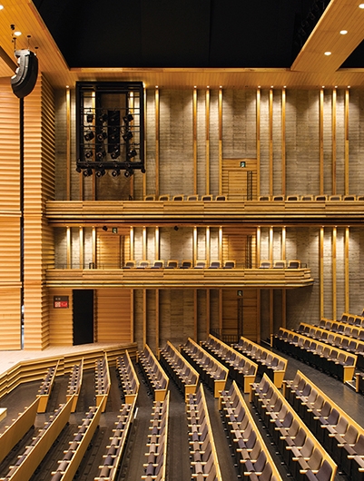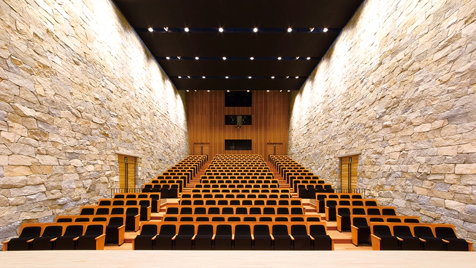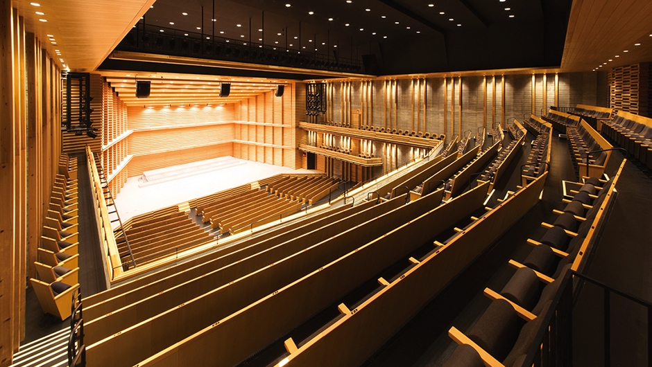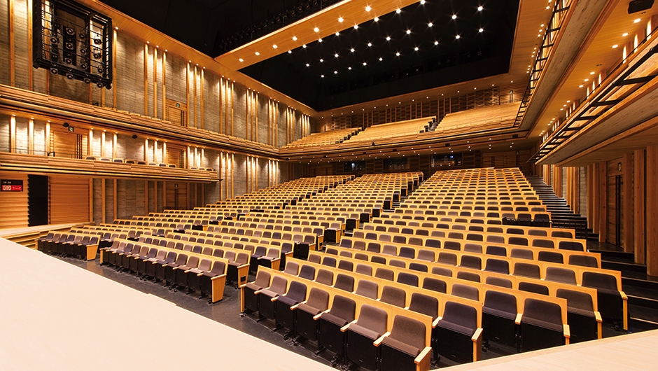 旧市民会館の老朽化により、耐震などの観点から建て替えが計画され、中心市街地に観音寺市民会館が誕生しました。大・小ホールと多目的ホールで構成され、観音寺市民の新たな文化芸術の拠点となることを目指しています。大ホールの内装は、観音寺市の「ちょうさ祭り」の太鼓リズムを想起させる柱配置として木をふんだんに使用し、内装の意匠に合わせて座席にも杉材を採用しています。小ホールの壁面は、香川県産の庵治石(あじいし)を用いた石積壁で、国内外でも珍しいホールとなっています。