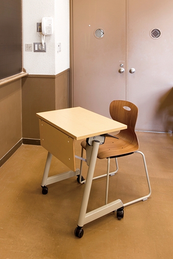2号館は教室棟となっており、一部教室の家具入替を実施。デスクの幕板は天板と同じ仕様とし、脚部はイスの脚部と塗装を合わせて統一感を図っています。