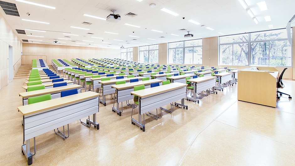 1階 大教室/講義デスク・イス:SCF-5105特注品、移動イス:SCM-5105、移動デスク:CTN4特注品 総席数311席、講師用イス:インフィー