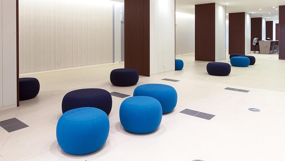 2階 コミュニケーションラウンジ/イス:チャット、テーブル:DTN特注品、スクエアテーブル、ホワイトボード