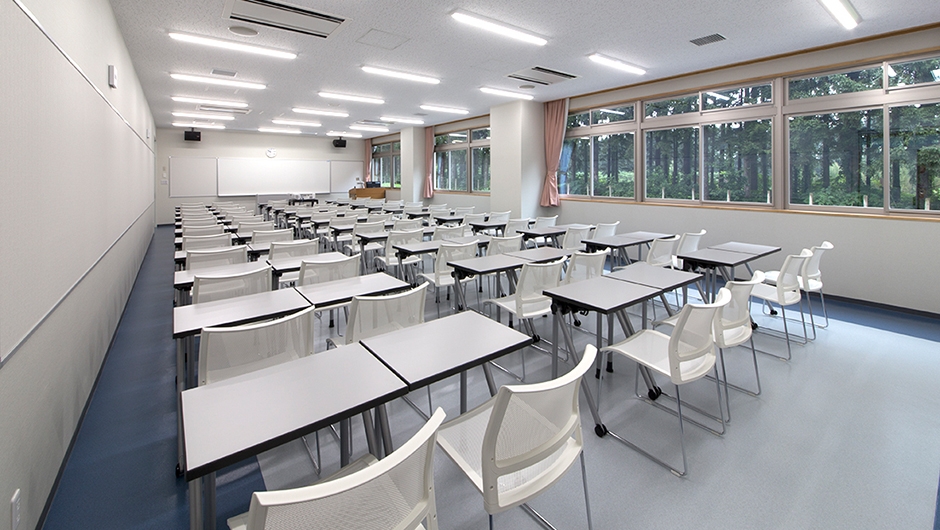 平成28年9月に竣工した新校舎は、約400人収容の「アクティブホール」を初め、講義室、演習室、保健室、相談室など、勉学と学生生活を快適にするための施設が設置されています。既存校舎連絡通路とエントランスとの間にあり、多くの学生が行き来する学生ラウンジは、2層吹き抜けの大きなガラス面を持つ開放的な大空間となっており、学生のくつろぎと交流の場として期待されています。尚、当校舎と学生ラウンジの愛称「スチューデントホール」「岩姫ラウンジ」は、学内と卒業生からの応募で選ばれました。