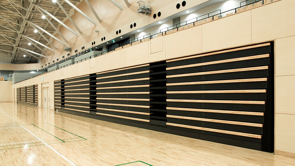 メインアリーナ/1階席 移動観覧席「テレスコープスタンド」:AHP-A8200-30特注品 1152席(288席×4ブロック)、2階席 固定観覧席:PWS2-WF、PWS2-FF 1480席 総席数2632席