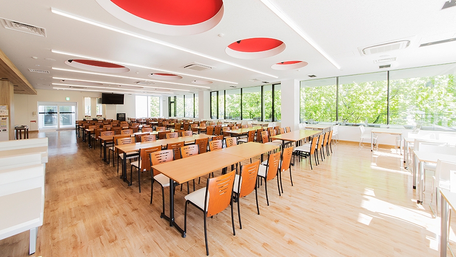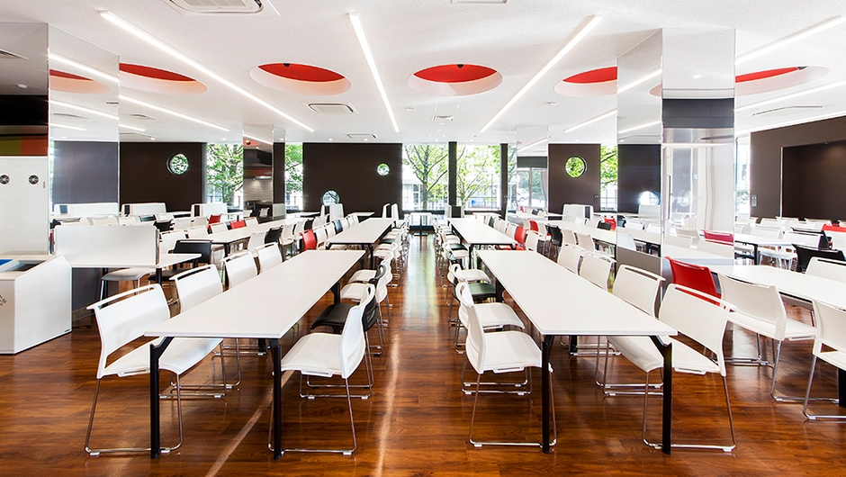 キャンパスの再整備が進められ、2015年に完成した新2号館に続き、新食堂棟となるセントラルテラスが誕生。キャンパス内の別々の場所にあった2つの食堂が、建物の1階と2階にそれぞれ移転し、食堂機能が集約されました。緑豊かなキャンパスの中央に位置しており、食事をするだけでなく、交流の場として学生達に利用されます。2階のテラスは多目的スペースとなっており、バーべキューなどを楽しむことができます。