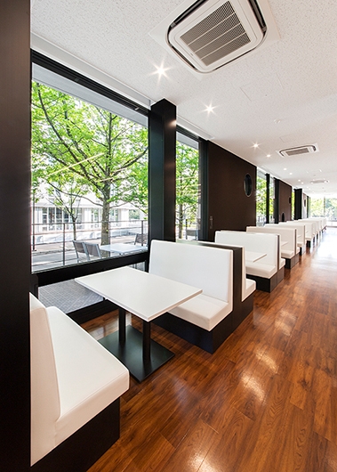 1階 カフェ&レスト セントラル(食堂)/イス:ティーポ特注品、テーブル:DTN、 カウンターテーブル特注品、ソファ、テーブル(ソファ席用)