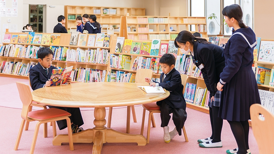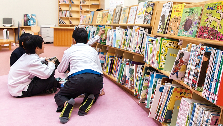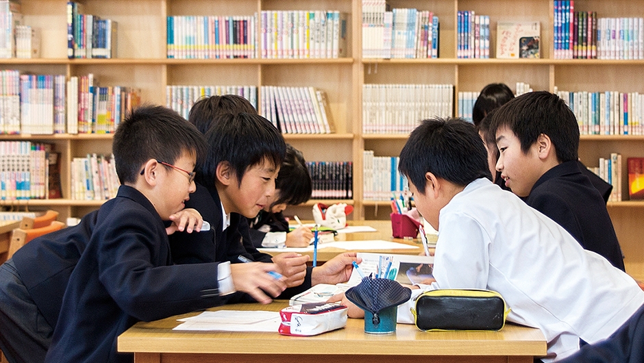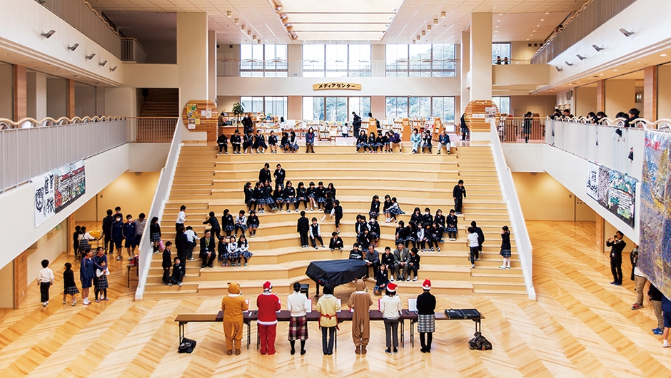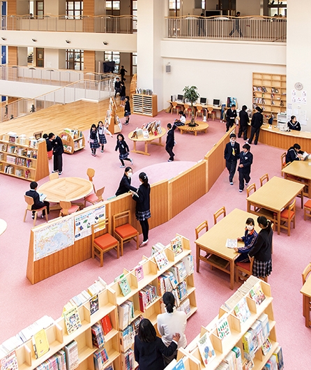 玄海みらい学園は、町内の2つの中学校と2つの小学校を統合し、施設一体型の小・中一貫校として2015年4月に開校。玄海町では、学校づくりについて年月をかけて話し合いが行われ、子どもたちが9年間を通して学年を越えて学び合い、新たなことに挑戦できる教育環境が整えられました。なかでも、学校の中心に位置するメディアセンターは、その教育にとって重要な役割を持ちます。