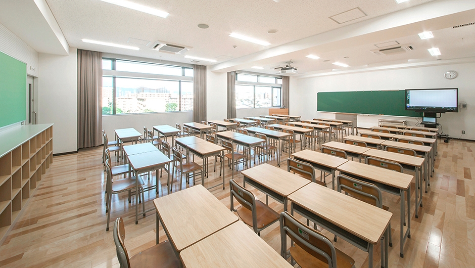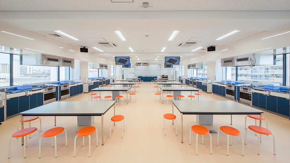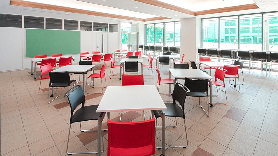 教育と保育のスペシャリストを養成するための新校舎。大講義室や、アクティブラーニング室、総合学修室は移動・収納性に優れたテーブル・イスが採用されました。また乳幼児家庭実習室や小学校模擬教室など、実践的なトレーニングが可能な様々な実習室を備えています。