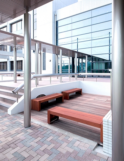1階 学生サロン/イス:ティーポ、ハイチェア:ティーポ、テーブル:DTN、ハイテーブル:特注品、電子レンジ 他