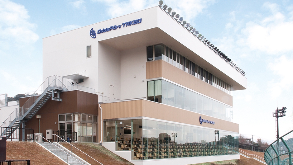 武雄競輪場は、既存施設の老朽化に伴い、走路及びメインスタンド棟のリニューアルを実施。新しいメインスタンド棟は、走路を挟んで既存施設の向かいに建設されました。