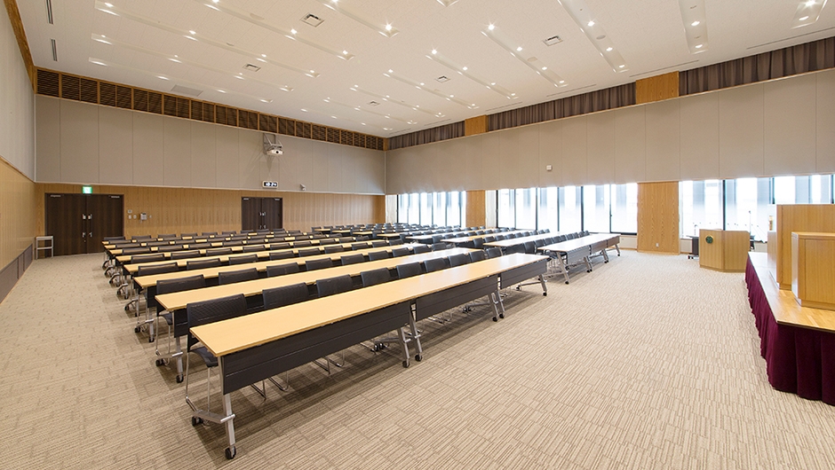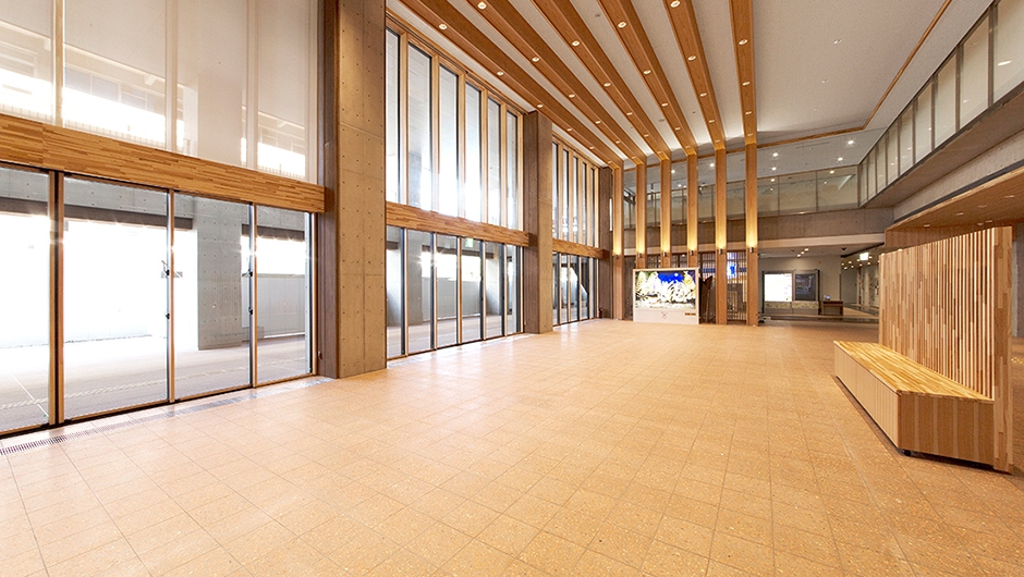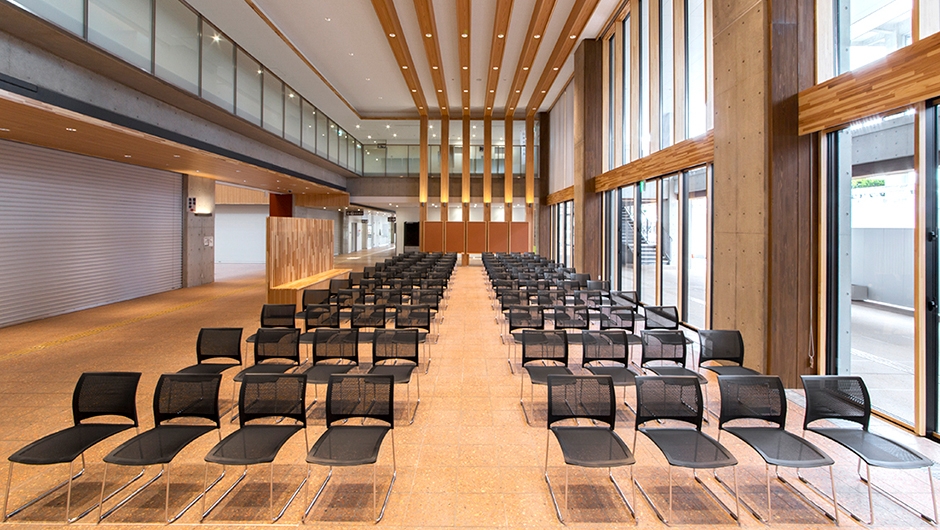 1階市民ホールは、扉を開放すると屋外の「市民の広場」と一体利用でき、様々なイベントに活用されます。5階の議会会議室や委員会室に設置されたテーブルは、いずれも天板や幕板にナラ材を採用し、重厚感を演出するとともに、全体の統一感や汎用性を高めています。