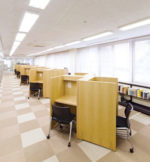 ICT機器や図書館資料などを利用したアクティブ・ラーニングを促し、ゼミ活動や授業にも対応できるフレキシブルな空間を創設するため、図書館のリニューアルが実施されました。図書館2階は、オープンワークスペースやグループ学習室などラーニング・コモンズエリアとして整備され、グループワークやプレゼンテーションなど図書館内でも会話が可能な学習スペースとなっています。3階は、個人学習スペースなどが用意され、個人が落ち着いて利用できる空間としています。