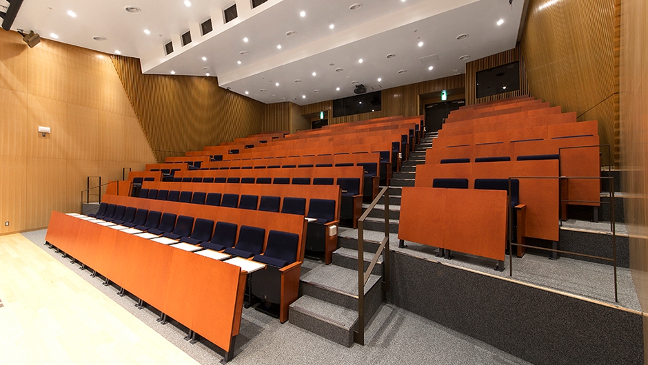 ホールは、客席194席を有し、貸出施設として利用される予定です。各席にはA3サイズの大型タブレットが備えられているため筆記を伴う聴講に対応できます。また、1人当たりの座席幅は550mmとゆとりを持った仕様となっています。