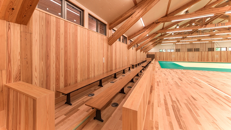 レクリエーションやスポーツを中心とした総合公園内に新設された武道場。施設には県産のスギ材やヒノキ材を使用している他、玄関やトイレなどには、地元の砥部焼のタイルを施しています。2017年の愛媛国体では、同公園がバドミントン競技の会場となっており、武道場も控室としての使用が予定されています。