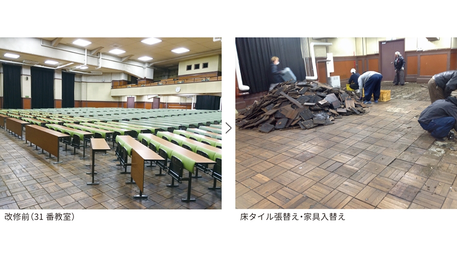 31番教室(改修後)/講義デスク・イス:SCF-1507特注品 1階700席・2階78席 総席数778席、内装改修(床タイル)